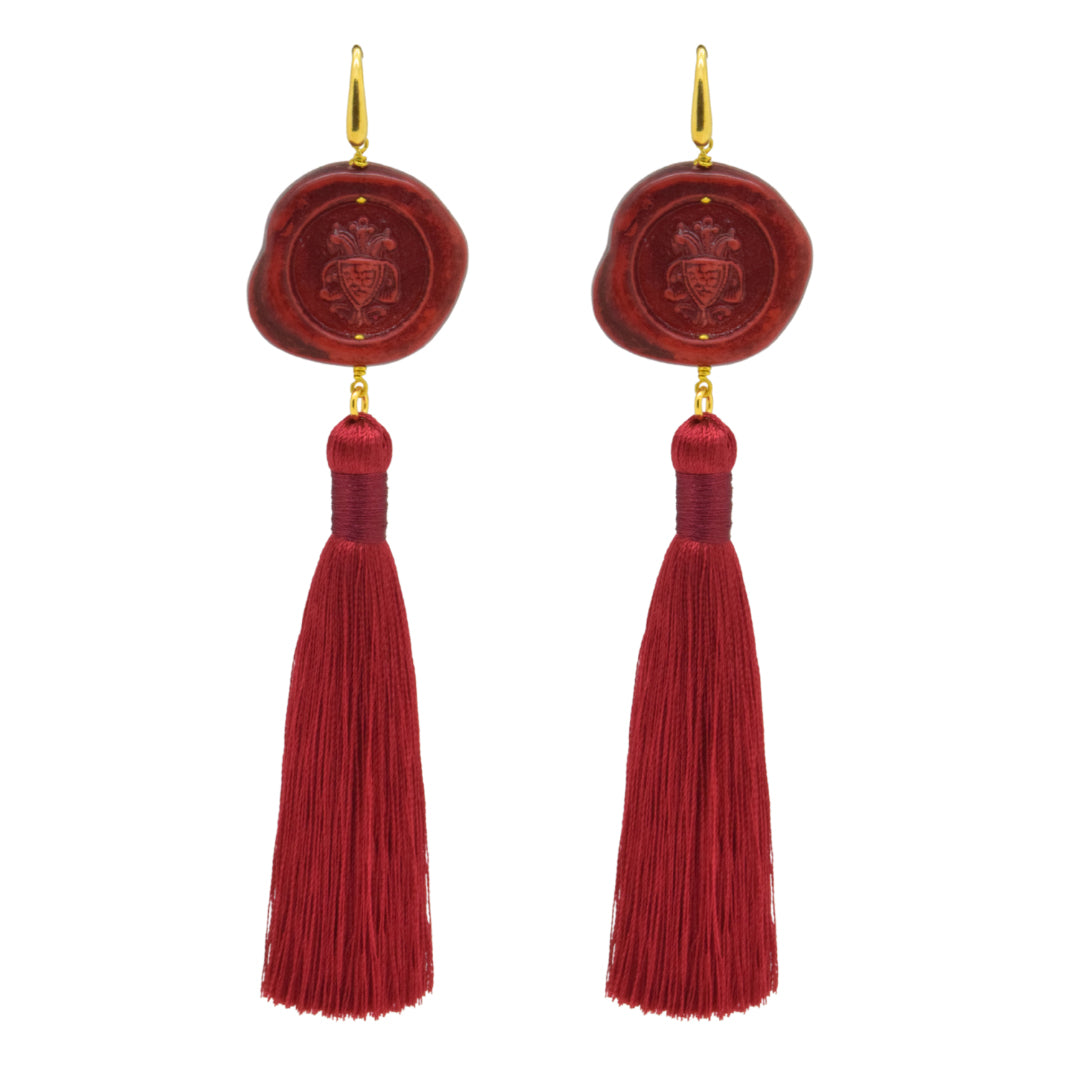 Deze prachtige Letter to The Queen oorbellen bestaan uit een prachtige rode letterstempel met een middeleeuwse gravure en een bordeaux rood kwastje. Deze oorbellen zijn chique én leuke eye-catchers.
