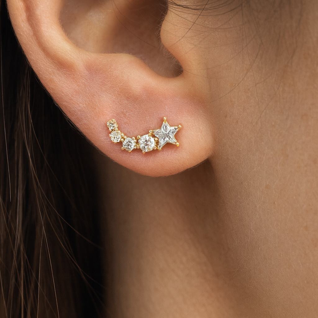Deze elegante ear climbers volgen soepel de curve van je oorlel. Het ontwerp begint bij een stervormige steen, die doet denken aan dat ene fonkelende moment waarop alles even klopt. Daaromheen schitteren meerdere kristallen in verschillende formaten: luchtig, speels en toch verfijnd. Het warme 18K vergulde zilver laat elke Swarovski steen tot leven komen.
