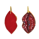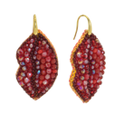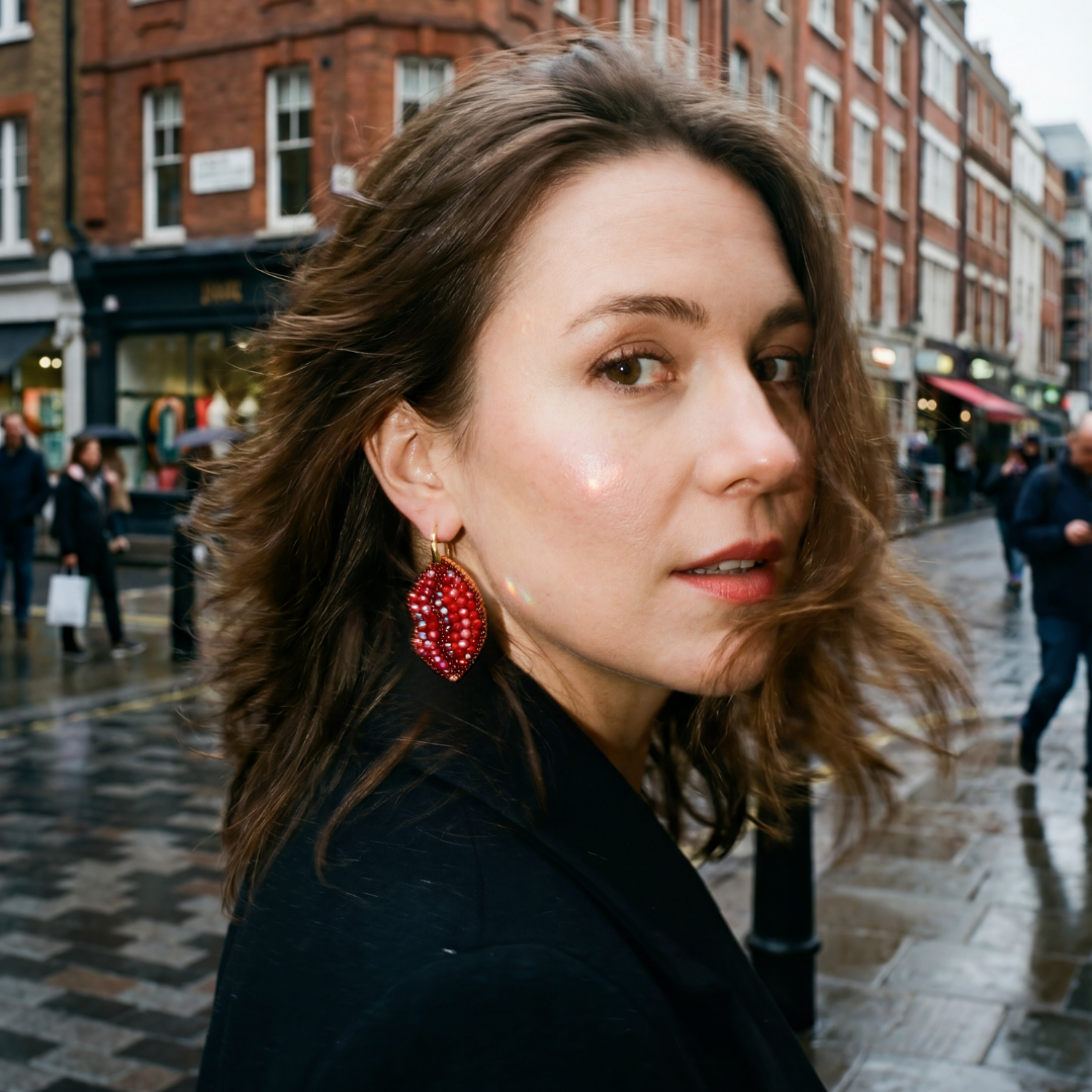 Met de hand geborduurd uit talloze facetgeslepen kralen in diepe rood- en bordeauxtinten, vangen ze het licht bij elke beweging. De organische vorm voelt bijna als een natuurlijk object – zacht, gelaagd en vol karakter.