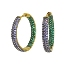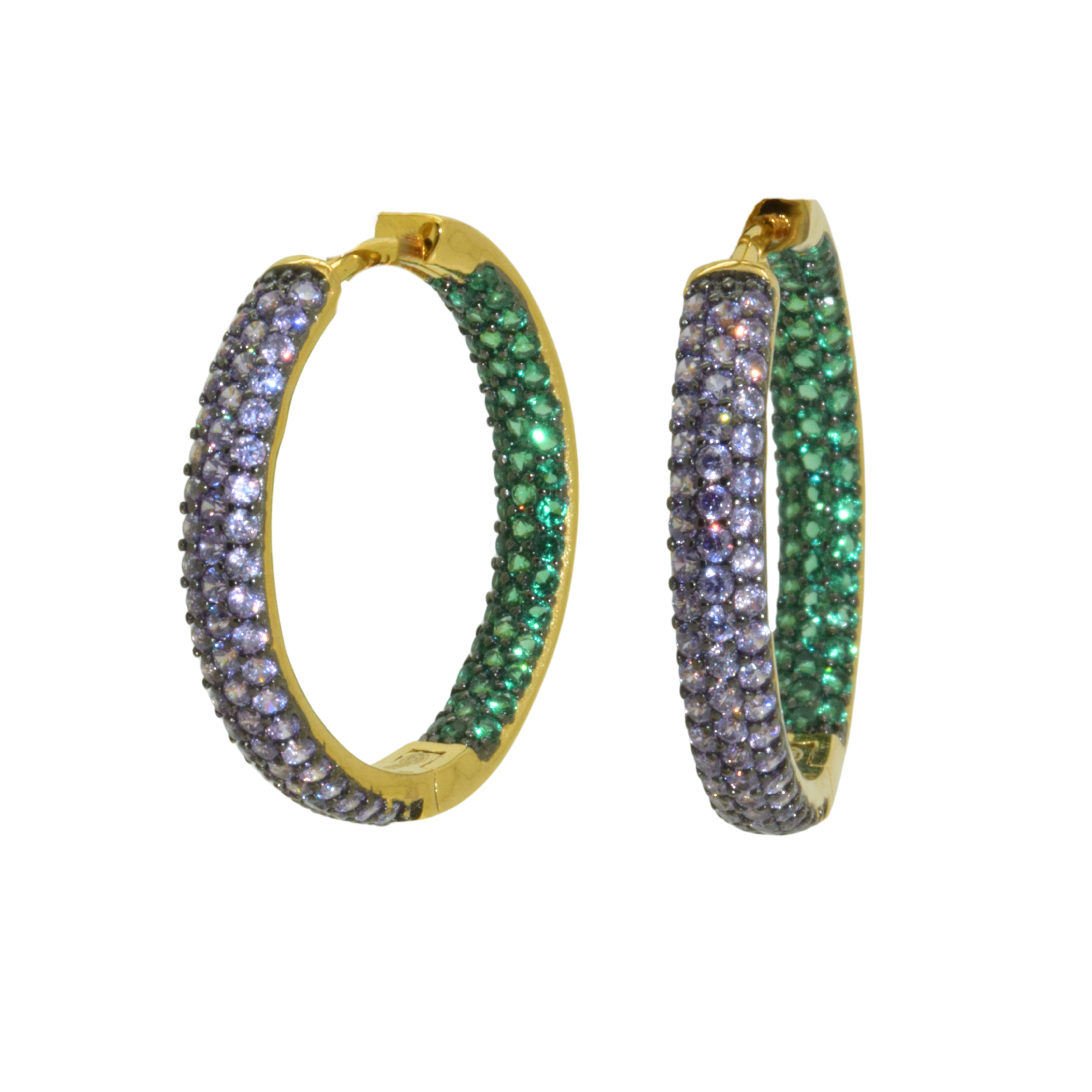 Our Crystal Hoops (2.5 cm) combine subtle elegance with an eye-catching shine. Three rows of finely set mini crystals — in soft lilac and deep emerald tones — catch the light from every angle, giving these hoops a modern and luxurious look.