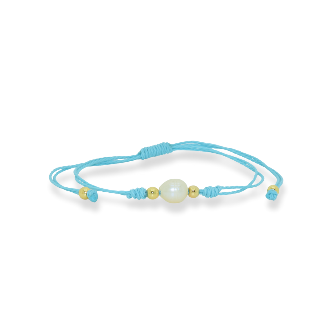 Elke armband is handgeknoopt in een frisse kleur en versierd met een echte zoetwaterparel, die subtiel glanst bij elke beweging. De kleine goudkleurige accenten geven het geheel een luxueuze, vrolijke uitstraling. Draag ‘m solo voor een minimalistische look of mix & match meerdere kleuren voor een speels, zomers effect.