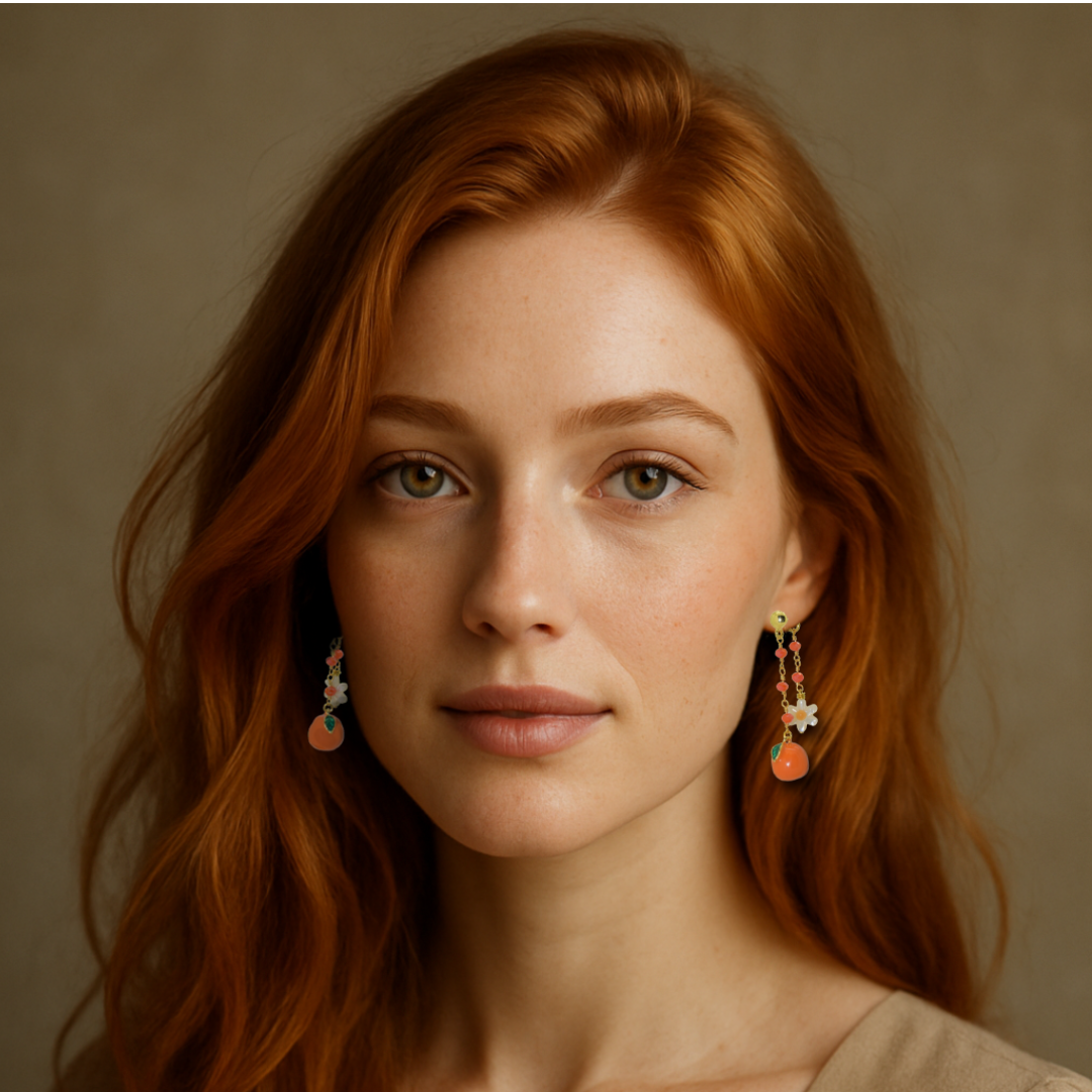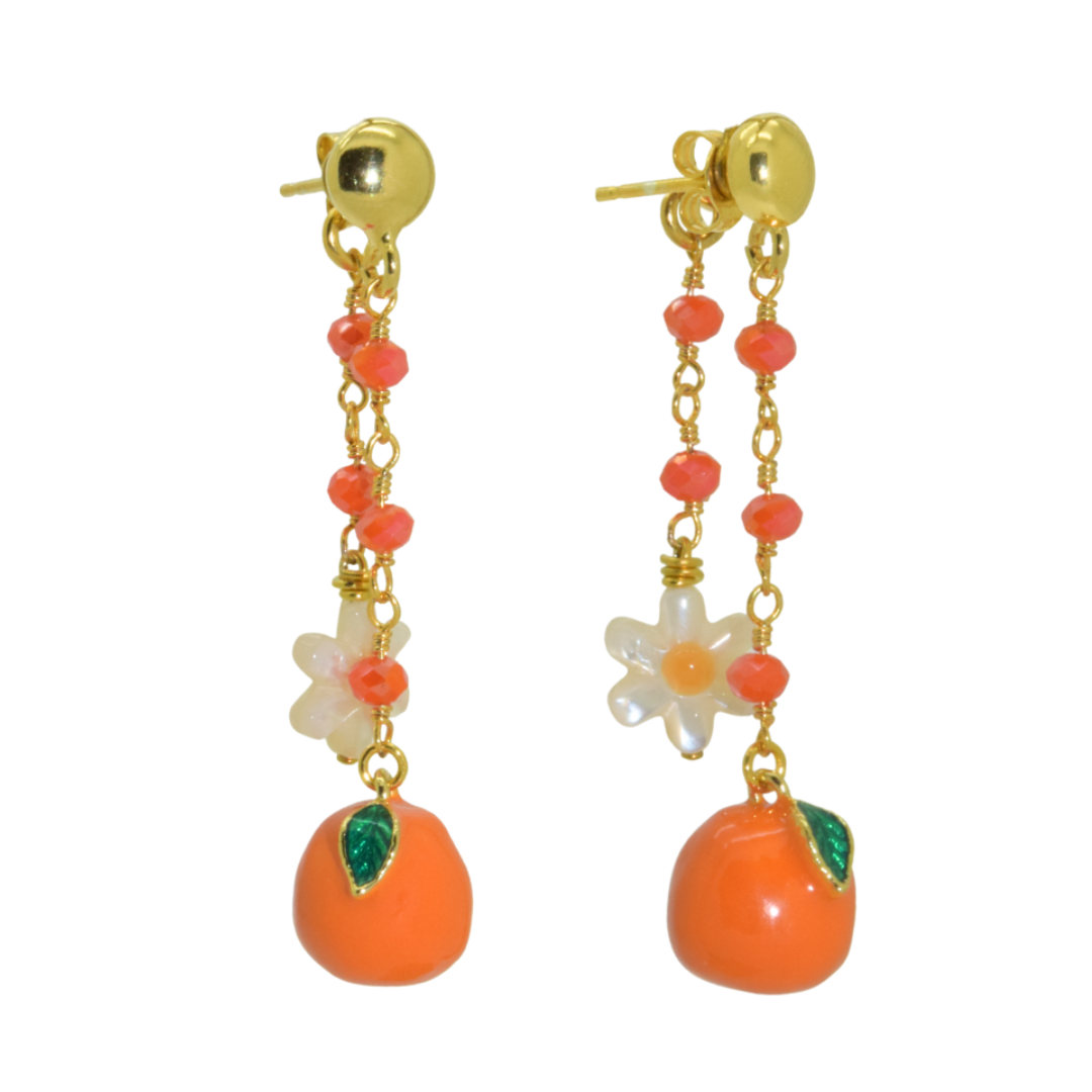 Onze speciale oorbel van november is een ode aan vrolijkheid en kleur: met glanzende gouden details, sprankelende oranje kraaltjes, een lieflijk parelmoeren bloemetje en natuurlijk de charmante clementine.