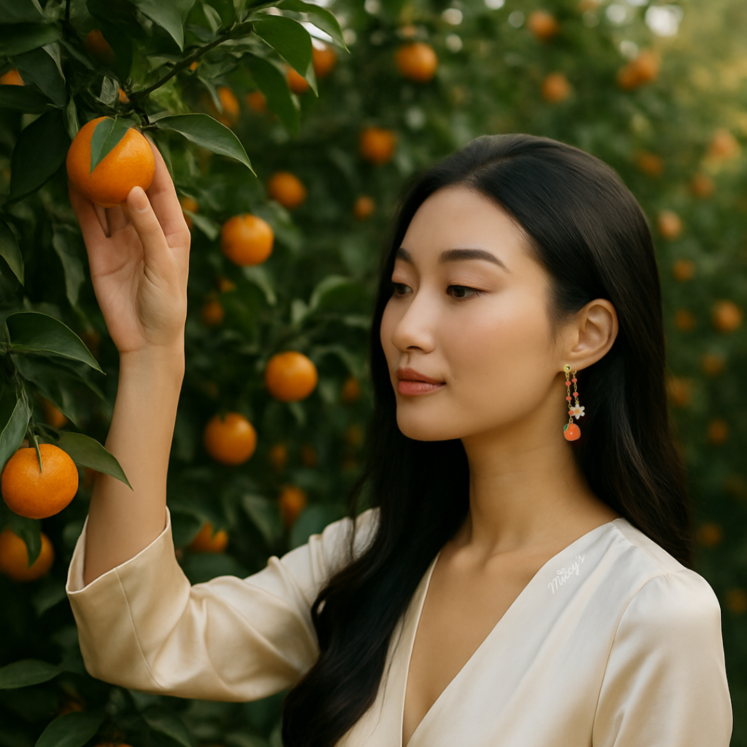 Deze oorbel brengt instant good vibes — of je nu een donkere trui draagt of een feestelijke jurk. Perfect voor wie haar stijl graag een vleugje speelsheid en vitamine C geeft 😉